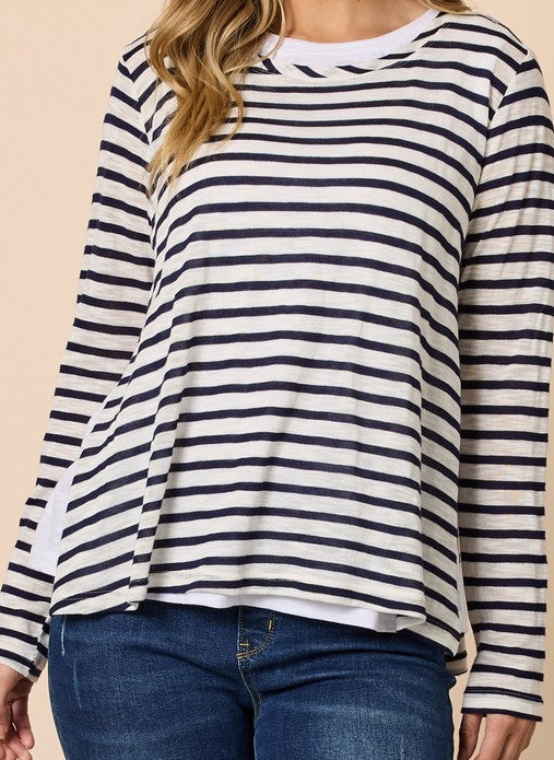 This 2-in-1 design features a soft white cami underneath a navy and white striped long-sleeve top, giving you the perfect layered look without any fuss.